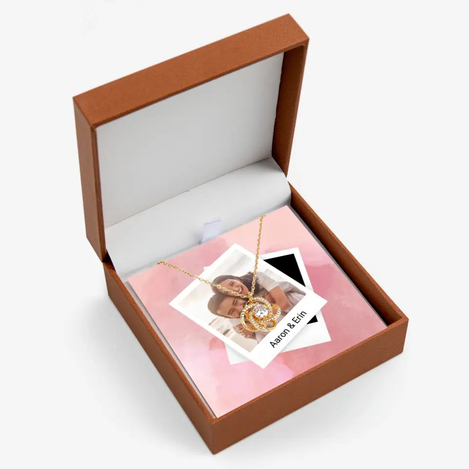 This personalized Love Knot Necklace boasts a high-quality brass pendant adorned with glass crystals and a captivating 6mm cubic zirconia center stone. The 18"-22" adjustable stainless steel chain offers durability and a lobster clasp. Opt for a sleek stainless steel or a luxurious 18k gold-plated finish, both tarnish-resistant for enduring brilliance. Customize your experience with a choice of three elegant box options, including LED, Textured Magnetic, or Brown PU Leather. The necklace is presented on a customizable semi-glossy 300gsm paper message card, ensuring an unforgettable gift for her.
