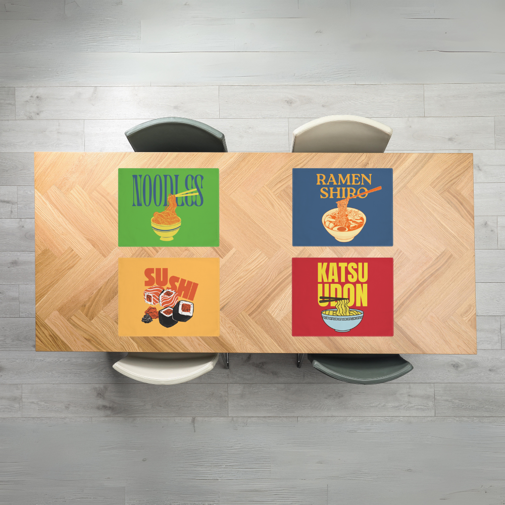 This Noodles Cotton Placemats 4pc set brings a playful touch to your kitchen! Featuring delightful prints like Ramen Shiro, Katsu Udon, Sushi, and Noodles, these placemats add charm to every meal. Perfect for daily dining or formal occasions, they're easy to clean, fade-resistant, and won't judge your spills!